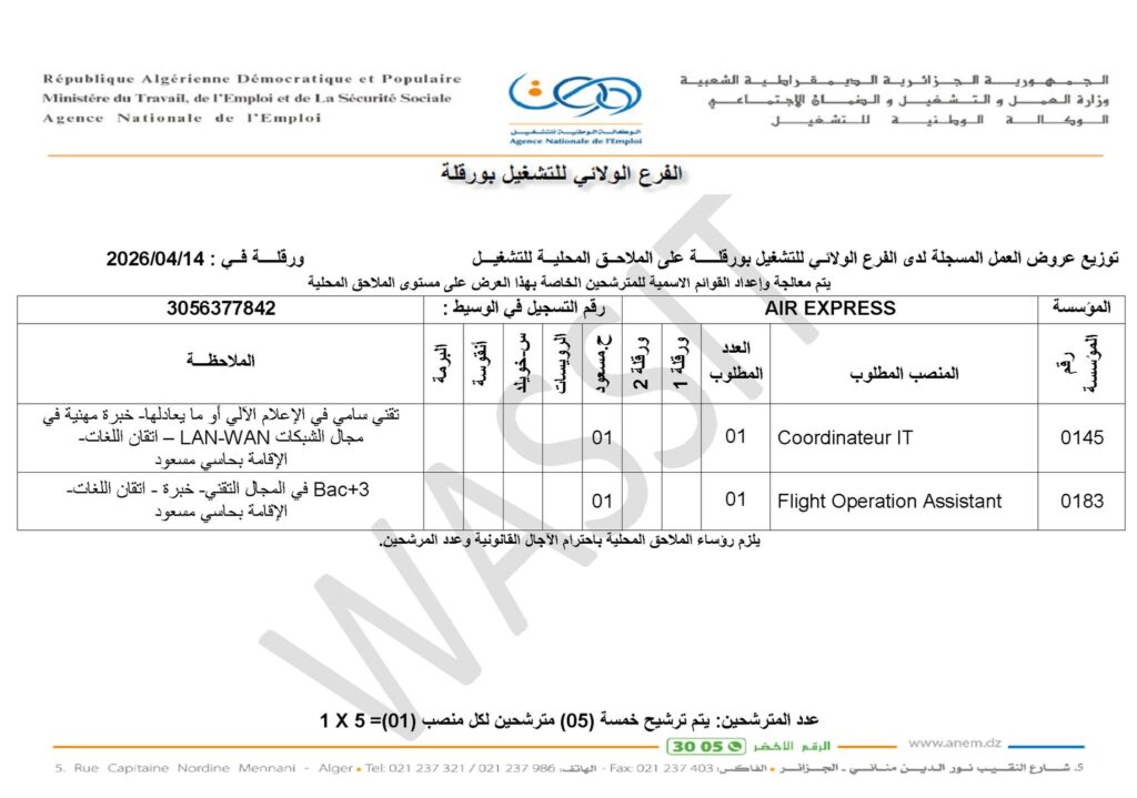 اعلان توظيف في مؤسسة شركة طيران AIR EXPRESS