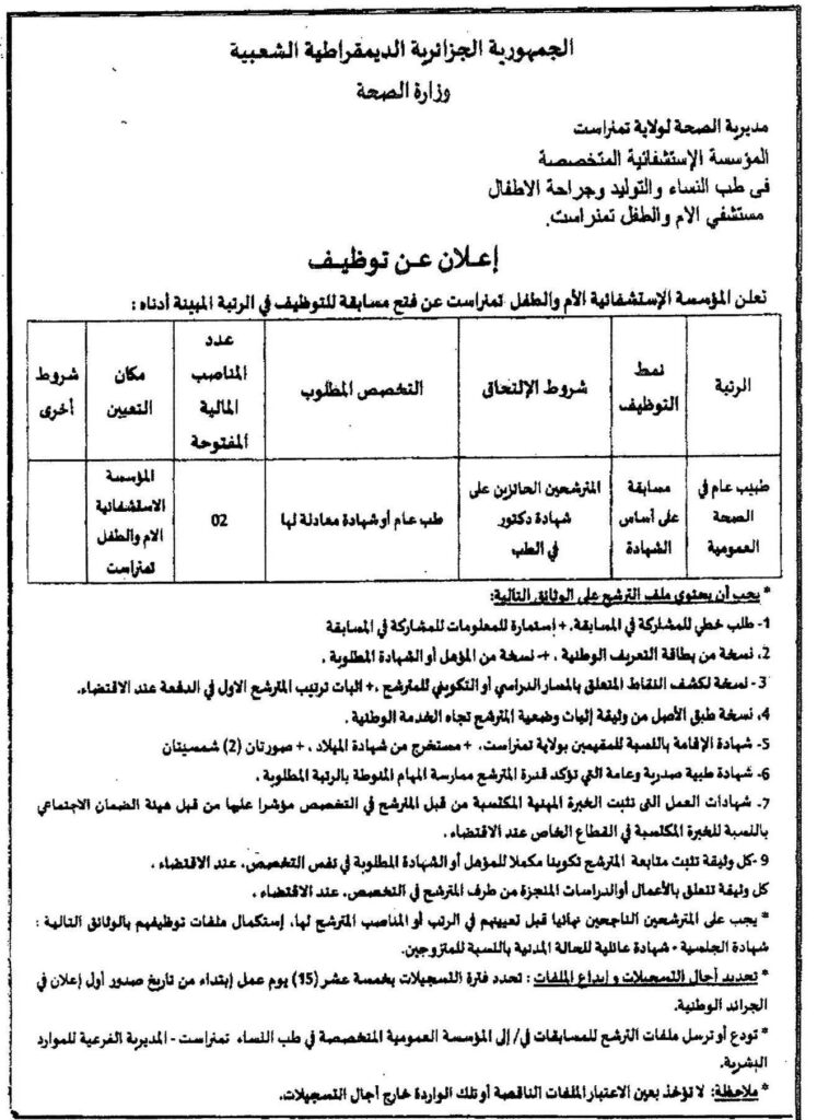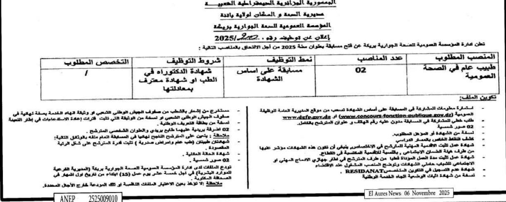 تعلن إدارة المؤسسة العمومية للصحة الجوارية عن فتح مسابقة توظيف بعنوان سنة 2025، للالتحاق بالمناصب التالية: