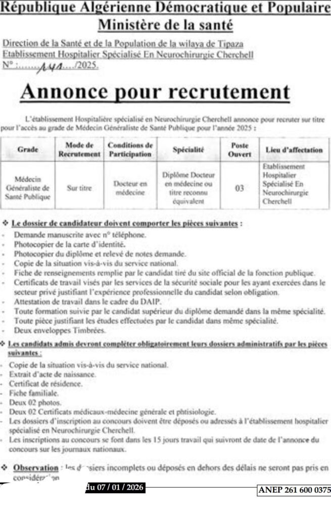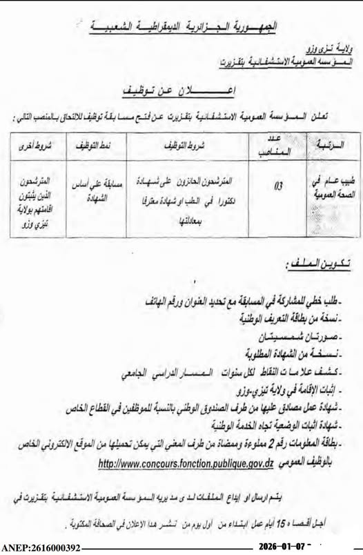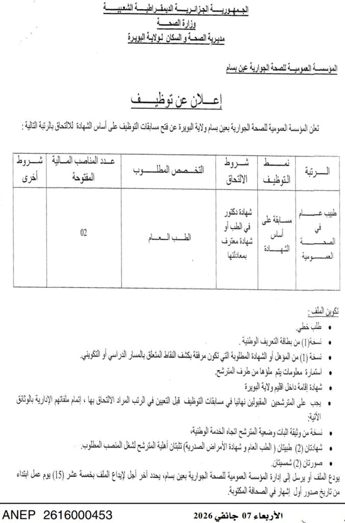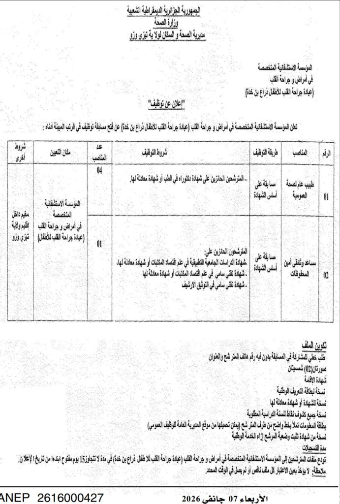 تعلن المؤسسة الاستشفائية المتخصصة في امراض وجراحة القلب تيزي وزو والمؤسسة العمومية للصحة الجوارية عين بسام عن فتح مسابقات توظيف للاطباء عامين