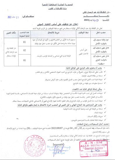 إعلان توظيف بدار الثقافة ولد عبد الرحمان كاكي مستغانم