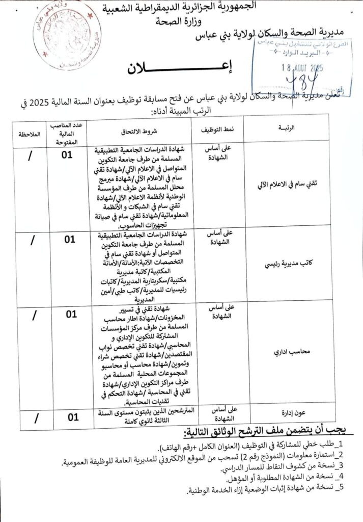 إعلان توظيف بعنوان السنة المالية 2025 في مديرية الصحة والسكان لولاية بني عباس