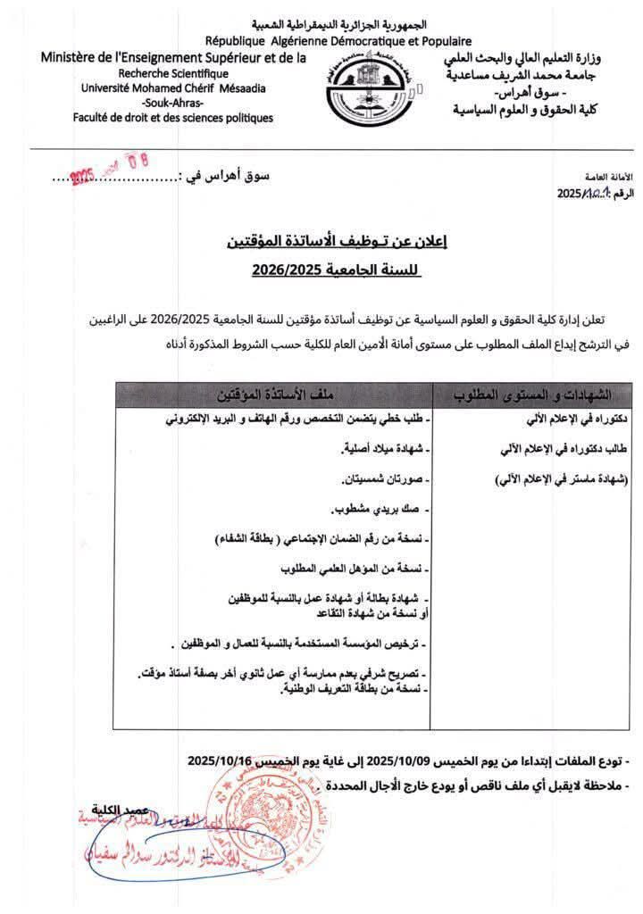 تعلن إدارة كلية الحقوق والعلوم السياسية بجامعة محمد الشريف مساعدية – سوق أهراس، عن فتح باب التوظيف لأساتذة مؤقتين للسنة الجامعية 2025 / 2026.