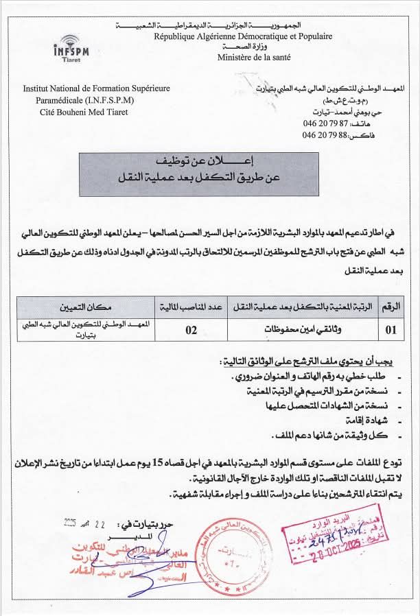إعلان عن توظيف عن طريق التكفل بعد عملية النقل بالمعهد الوطني للتكوين العالي شبه الطبي بتيارت