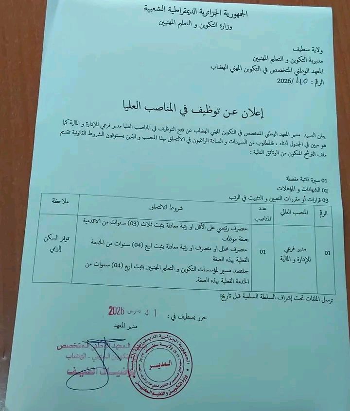 يعلن السيد مدير المعهد الوطني المتخصص في التكوين المهني الهضاب عن فتح التوظيف في المناصب العليا مدير فرعي للإدارة والمالية كما هو مبين في الجدول أدناه، فالمطلوب من السيدات والسادة الراغبين في الالتحاق بهذا المنصب والذين يستوفون الشروط القانونية تقديم ملف الترشح المتكون من الوثائق التالية: