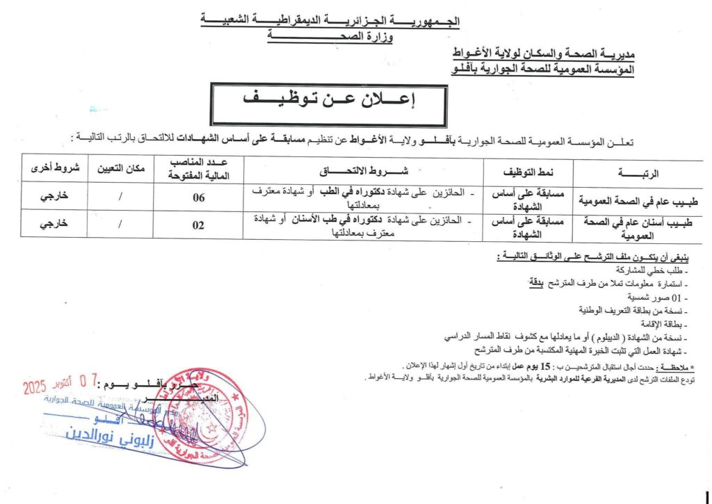 تعلن المؤسسة العمومية للصحة الجوارية عن فتح مناصب عمل في التخصصات التالية