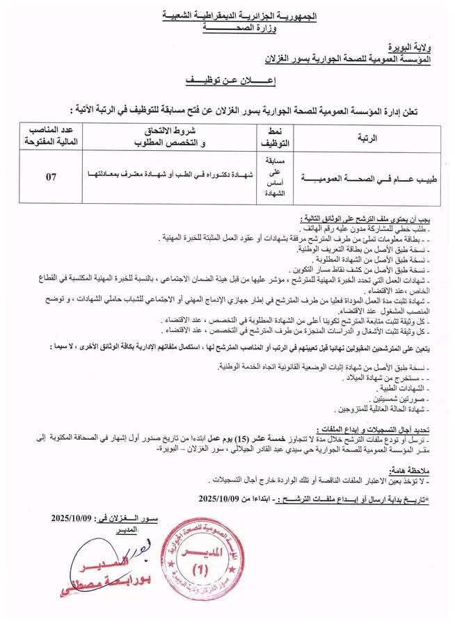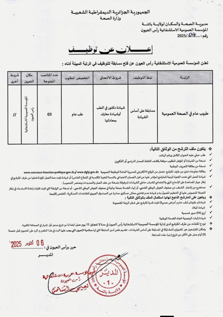 إعلان عن مسابقات توظيف أطباء عامين في الصحة العمومية لسنة 2025
