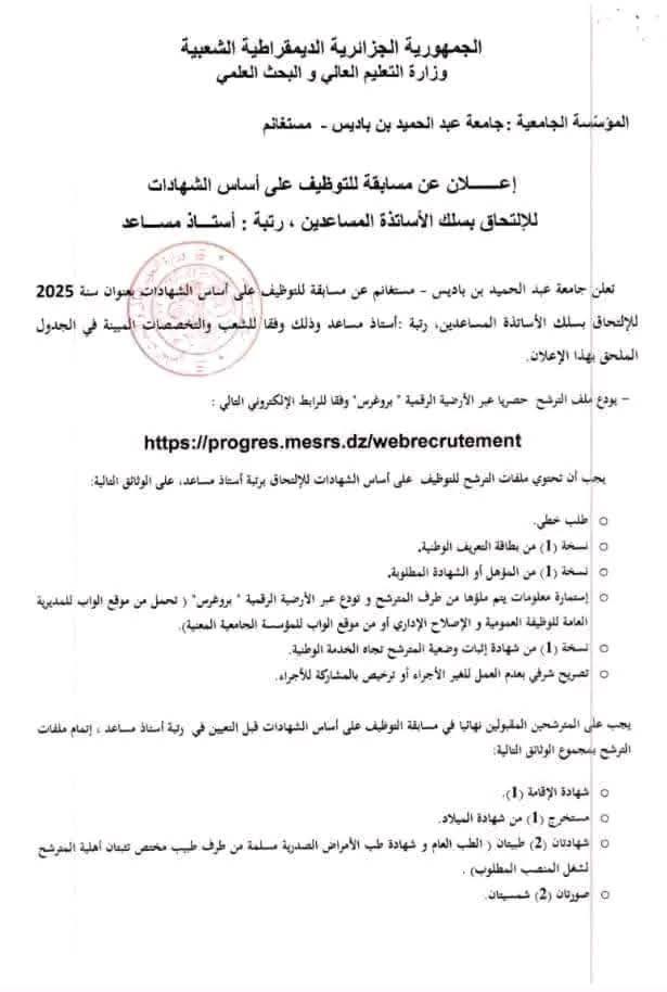 تعلن جامعة عبد الحميد بن باديس – مستغانم عن فتح مسابقة توظيف على أساس الشهادات بعنوان سنة 2025، للالتحاق برتبة أستاذ مساعد قسم “ب”، حسب الشعب والتخصصات الموضحة في الجدول المرفق بالإعلان.