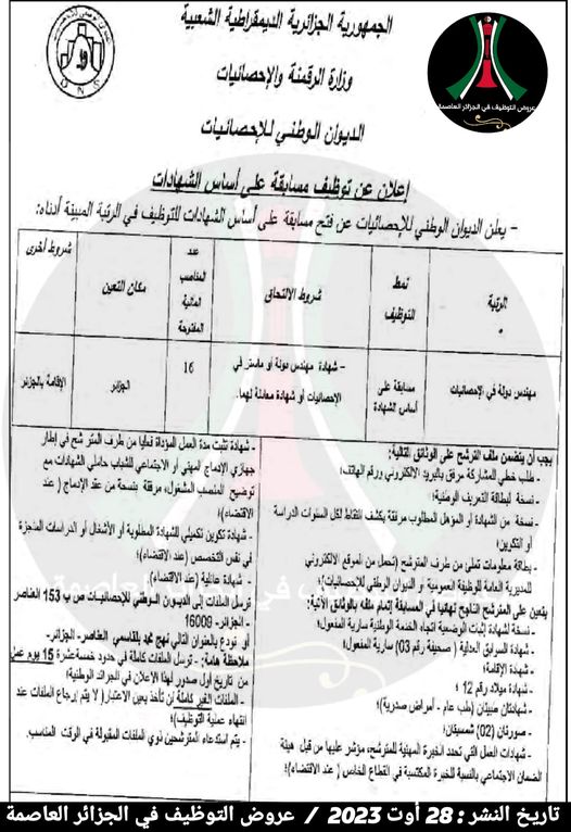 يعلن الديوان الوطني للإحصائيات عن فتح مسابقة توظيف على أساس الشهادات للتوظيف في الرتب التالية