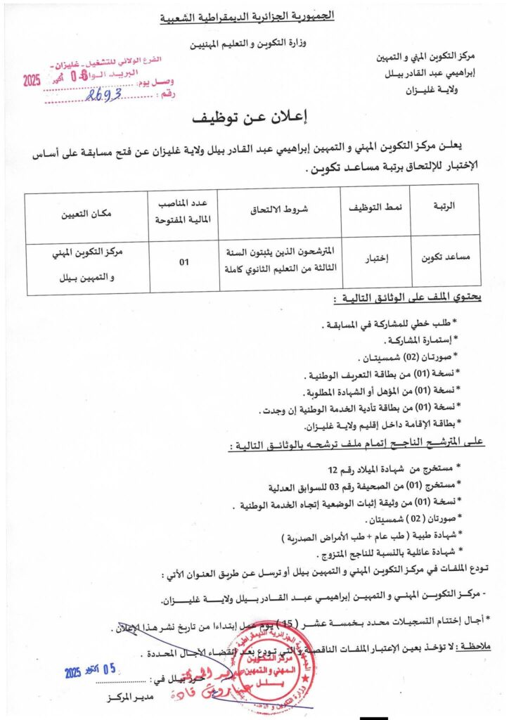 يعلن مركز التكوين المهني والتمهين “إبراهيمي عبد القادر” ببلّل – ولاية غليزان، ومركز التكوين المهني والتمهين “هواري بومدين” بتاجيقة، عن فتح مسابقات توظيف في الرتب المبينة أدناه: