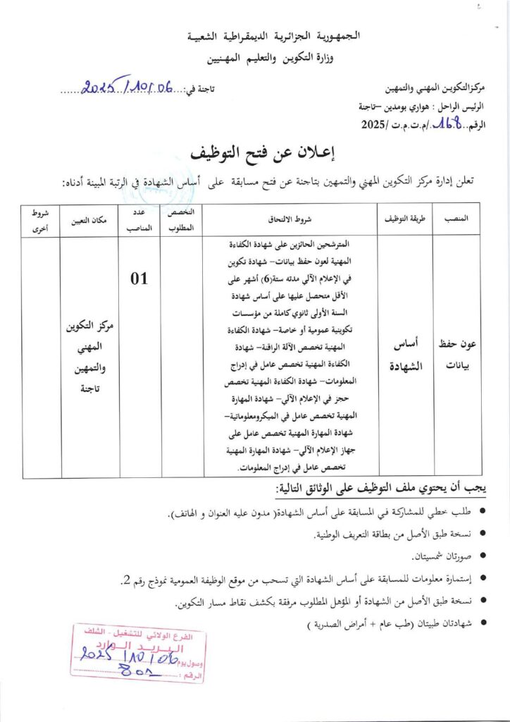 عون حفظ بيانات | على أساس الشهادة | شهادة كفاءة في الإعلام الآلي (مدة 6 أشهر على الأقل) أو شهادة مهنية مرتبطة بإدراج المعلومات أو استخدام الحاسوب، على أساس السنة الأولى ثانوي كاملة | الإعلام الآلي | 01 | مركز التكوين المهني والتمهين تاجيقة |