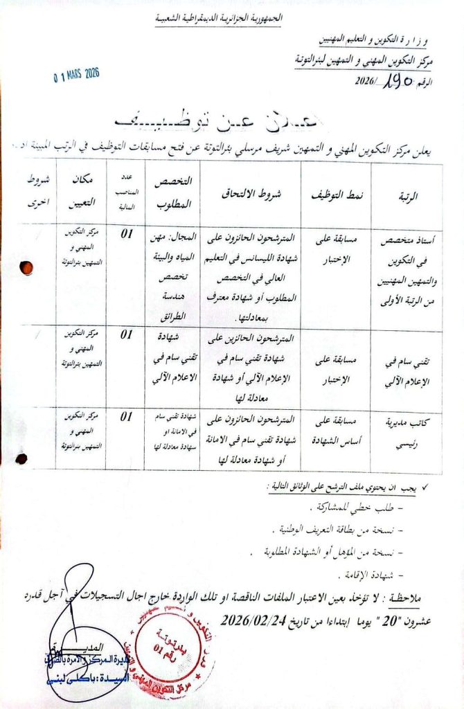 يعلن مركز التكوين المهني والتمهين شريف مرسلي ببئر التوتة عن فتح مسابقات التوظيف في الرتب المبينة أدناه: