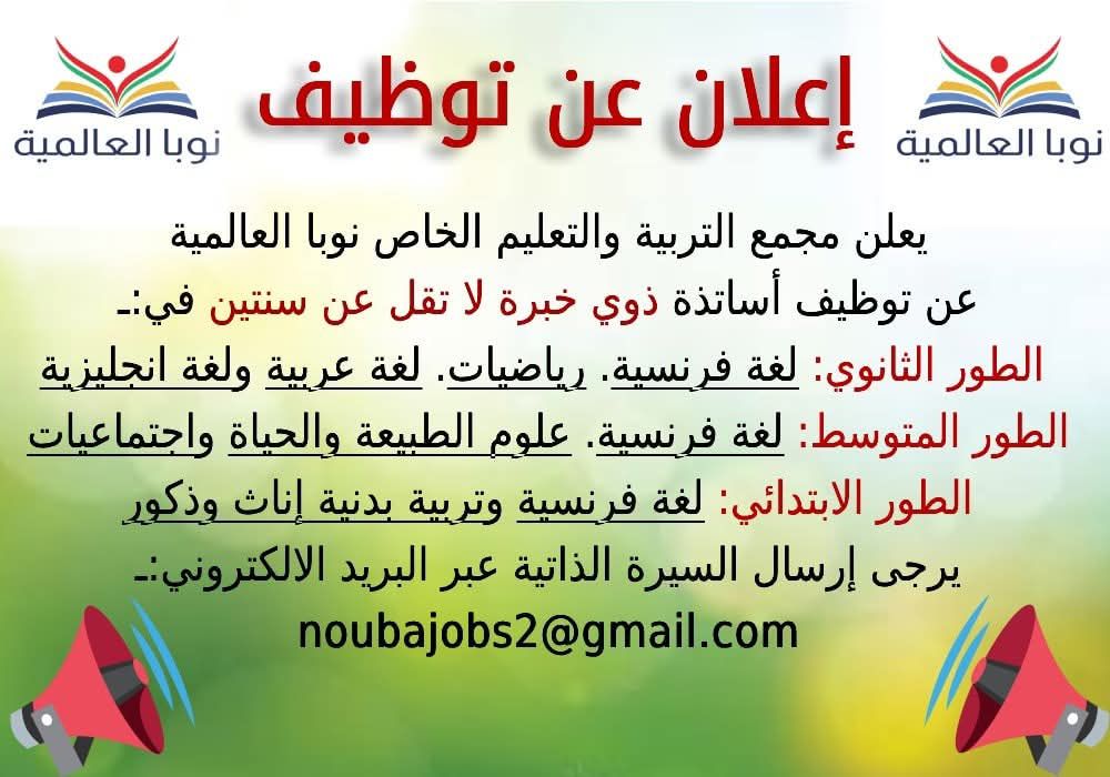 يُعلن مجمع نوبا العالمية (الخاص) عن فتح باب التوظيف لأساتذة ذوي خبرة لا تقل عن سنتين في التخصصات التالية: