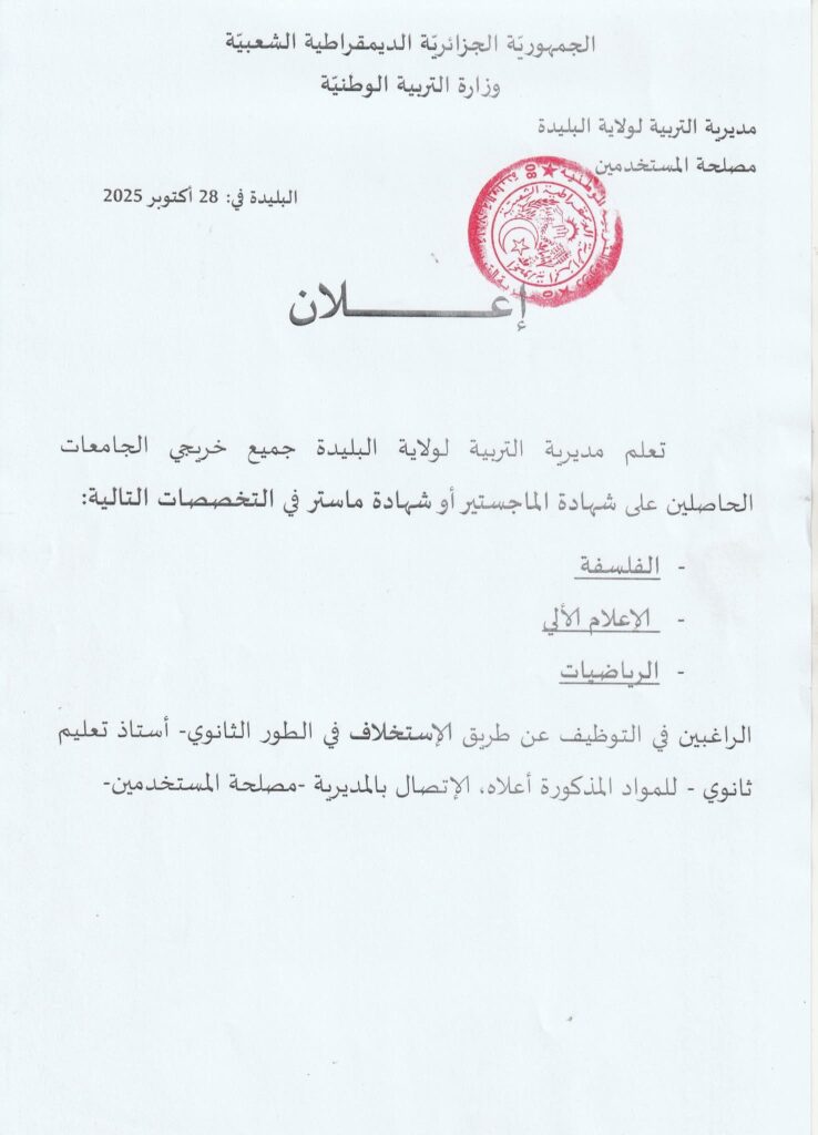 تعلم مديرية التربية لولاية البليدة جميع خريجي الجامعات الحاصلين على شهادة الماجستير أو شهادة ماستر في التخصصات التالية: