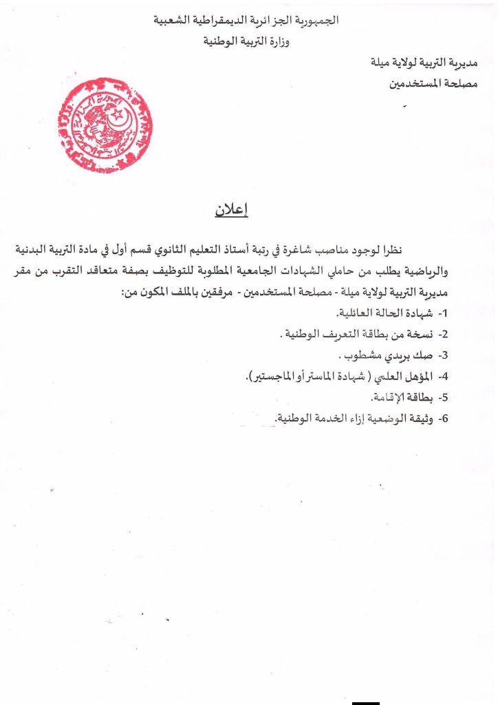 نظراً لوجود مناصب شاغرة في رتبة أستاذ التعليم الثانوي قسم أول في مادة التربية البدنية والرياضية يطلب من حاملي الشهادات الجامعية المطلوبة للتوظيف بصفة متعاقد التقرب من مقر مديرية التربية لولاية ميلة – مصلحة المستخدمين – مرفقين بالملف المكون من:
