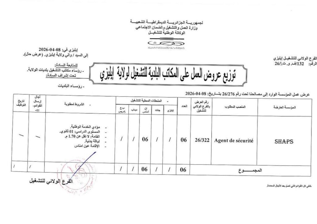 | SHAPS | Agent de sécurité (عون أمن) | 26/322 | 06 | إن أميناس (06 مناصب) |