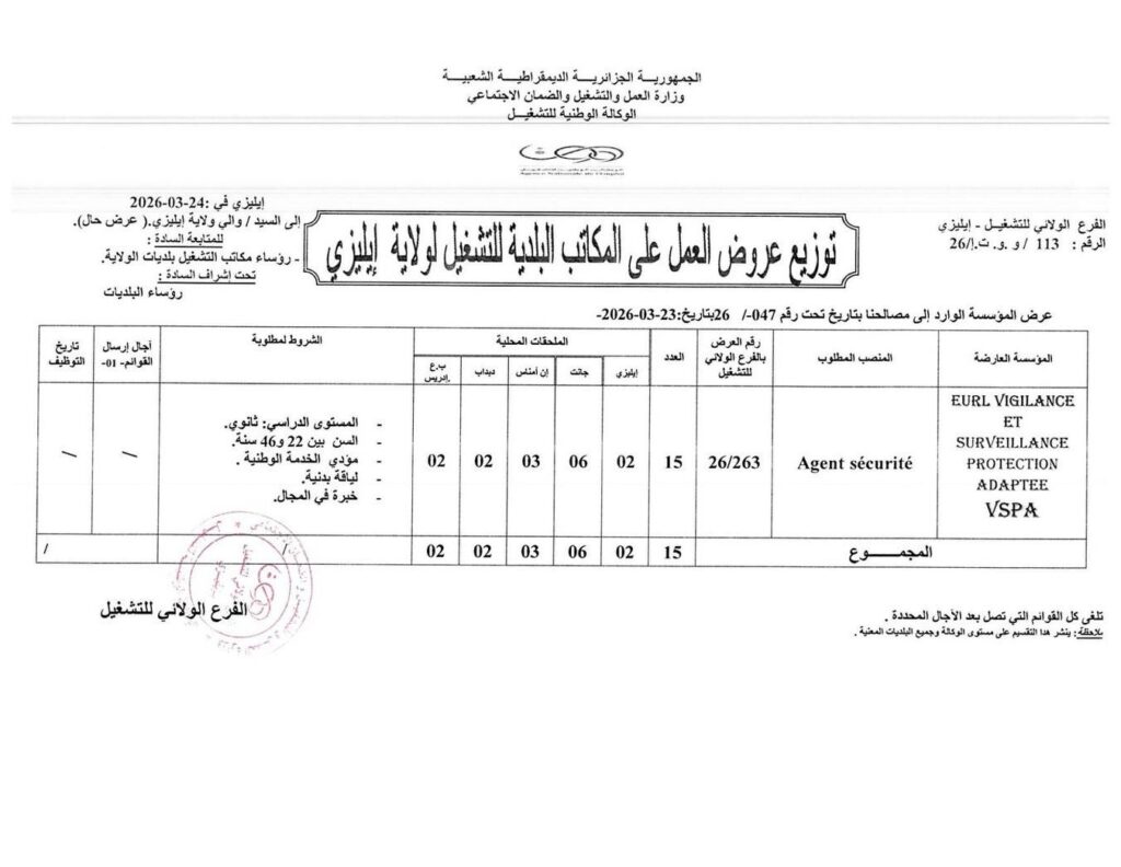الموضوع: توزيع عروض العمل على المكاتب البلدية للتشغيل لولاية إيليزي.
