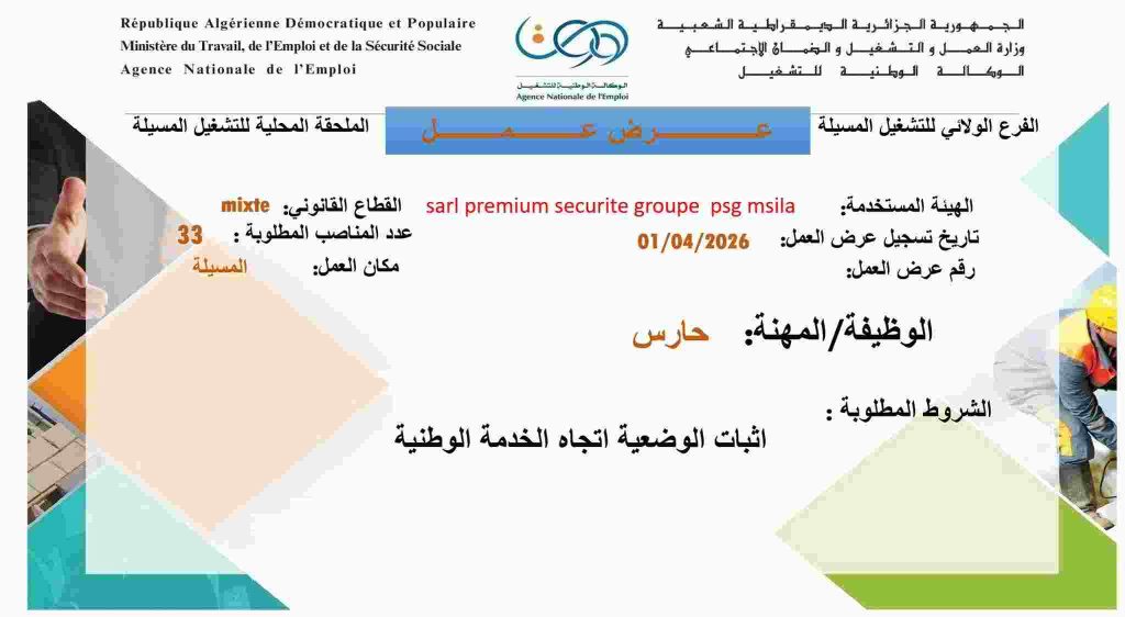 الهيئة المستخدمة: SARL Premium Securite Groupe PSG M’sila