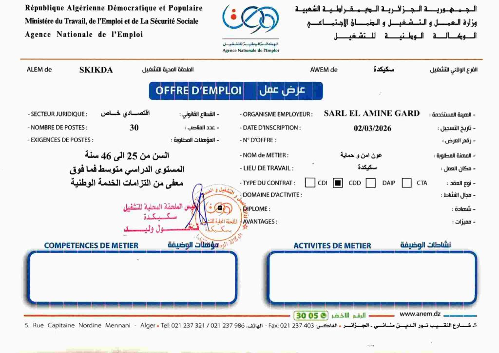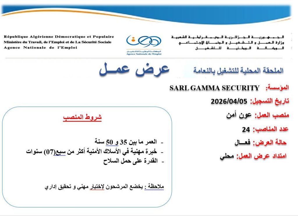 الهيئة المستخدمة: مؤسسة الحراسة أمنال (SARL AMNAL)