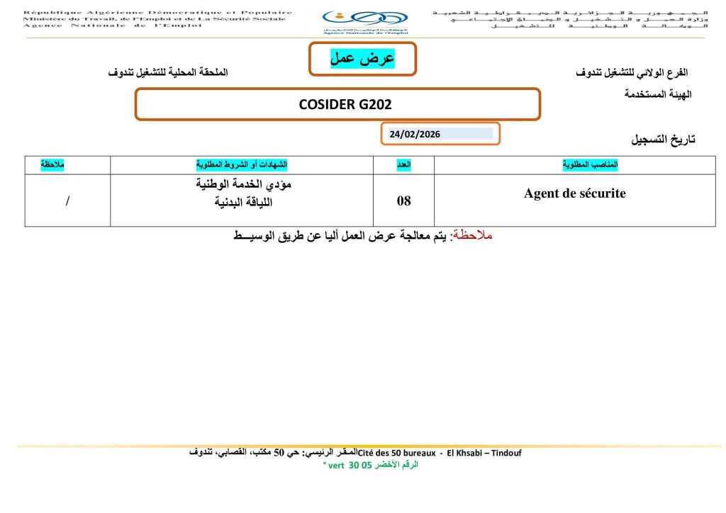 | Agent de sécurité | 08 | مؤدي الخدمة الوطنية / اللياقة البدنية | / |