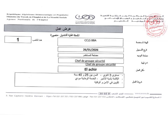تعلن الملحقة المحلية للتشغيل – منصورة عن توفر مناصب شغل في بلدية الأشير بالاختصاصات التالية: