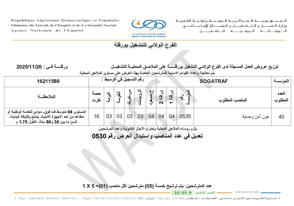 اعلان توظيف اعوان حراسة في شركة SOGATRAF (40 منصب)