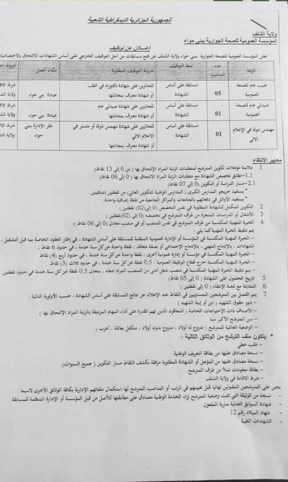 تعلن المؤسسة العمومية للصحة العمومية بني حواء الشلف عن فتح مسابقات من أجل التوظيف الخارجي على أساس الشهادات