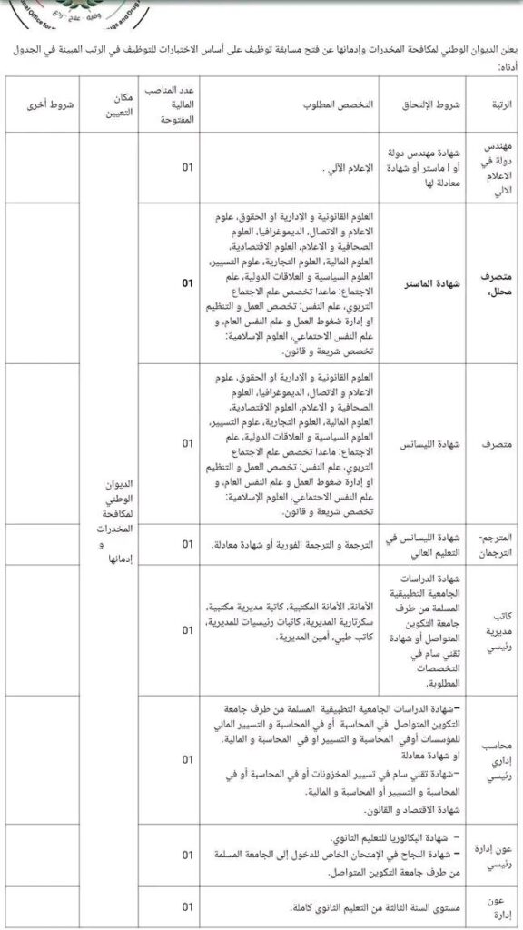 اعلان توظيف بالديوان الوطني لمكافحة المخدرات وإدمانها