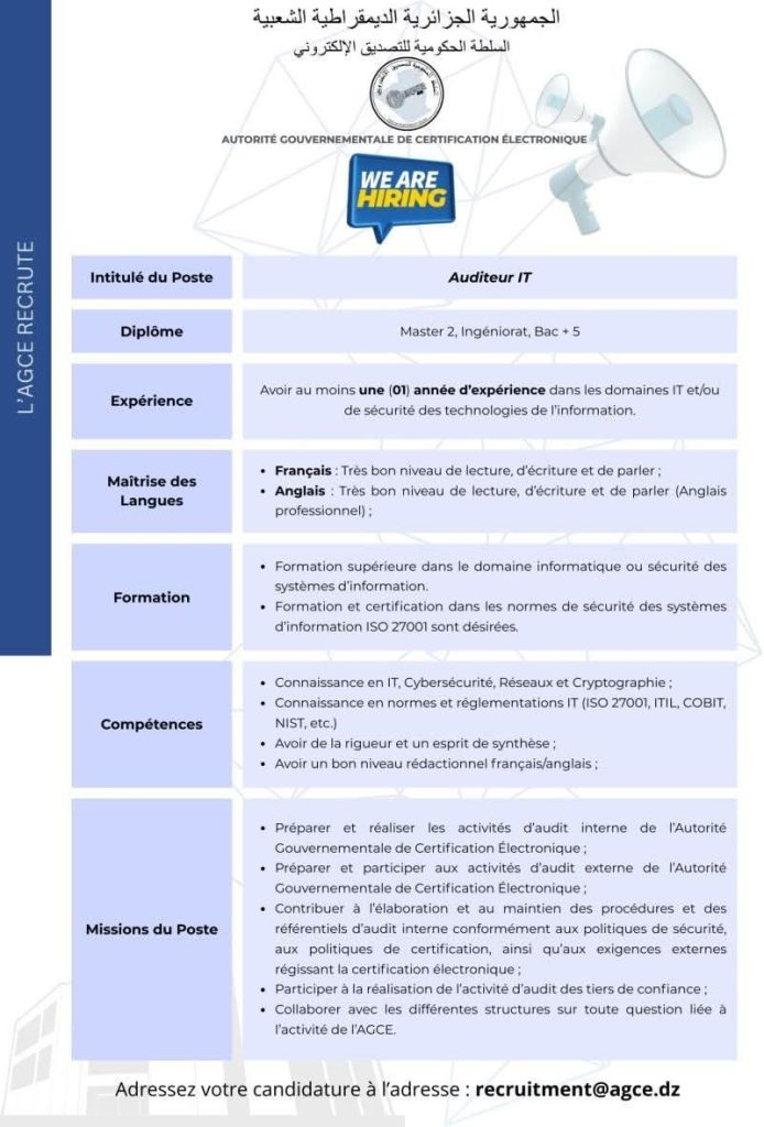 | مهام الوظيفة | • إعداد وتنفيذ أنشطة التدقيق الداخلي للسلطة الحكومية للتصديق الإلكتروني. • إعداد والمشاركة في أنشطة التدقيق الخارجي للسلطة الحكومية للتصديق الإلكتروني. • المساهمة في إعداد وصيانة إجراءات ومراجع التدقيق الداخلي وفقاً لسياسات الأمن، سياسات التصديق، والمتطلبات الخارجية المنظمة للتصديق الإلكتروني. • المشاركة في تنفيذ نشاط التدقيق للأطراف الثالثة الموثوقة. • التعاون مع مختلف الهياكل في أي مسألة تتعلق بنشاط سلطة AGCE. |