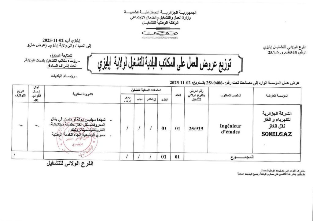 اعلان توظيف بالشركة الجزائرية للكهرباء والغاز نقل الغاز SONELGAZ