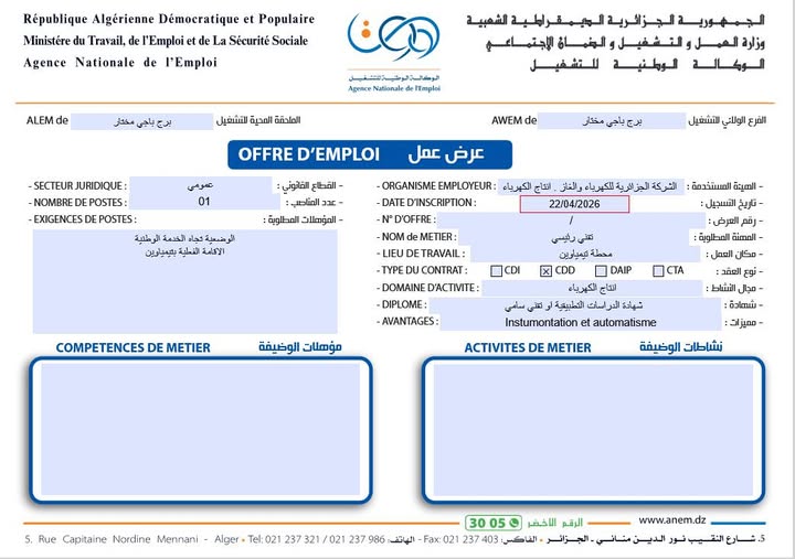 • الهيئة المستخدمة: الشركة الجزائرية للكهرباء والغاز – إنتاج الكهرباء (Sonelgaz)