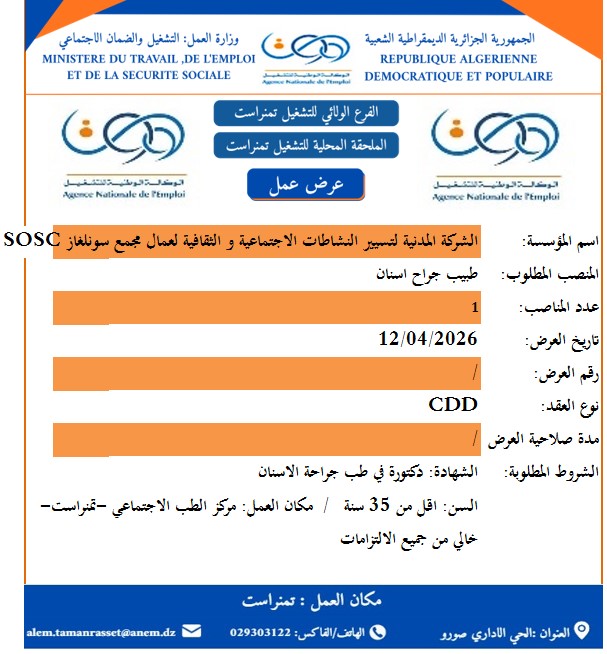 السن: أقل من 35 سنة / مكان العمل: مركز الطب الاجتماعي -تمنراست-
