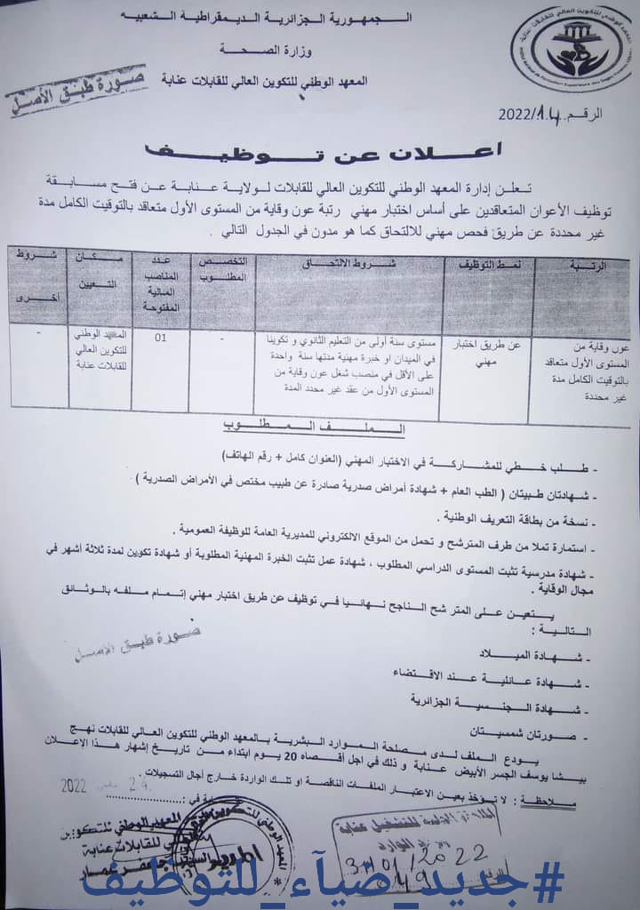 اعلان توظيف بالعهد الوطني للتكوين العالي للقابلات عنابة