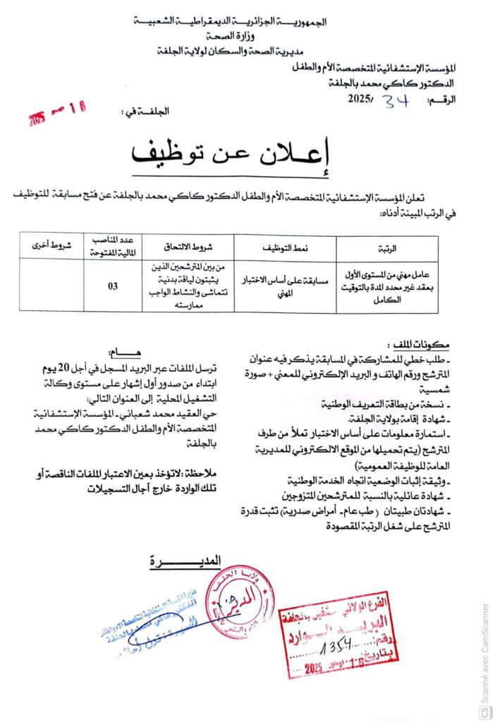 تعلن المؤسسة الإستشفائية المتخصصة الأم والطفل الدكتور كاكي محمد بالجلفة عن فتح مسابقة للتوظيف في الرتب المبينة أدناه: