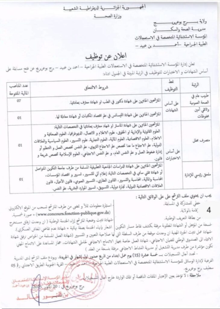 تعلن إدارة المؤسسة الاستشفائية المتخصصة في الاستعجالات الطبية الجراحية أحمد بن عبيد – برج بوعريريج عن فتح مسابقة توظيف على أساس الشهادات والاختبارات للالتحاق بالرتب المبينة في الجدول أدناه: