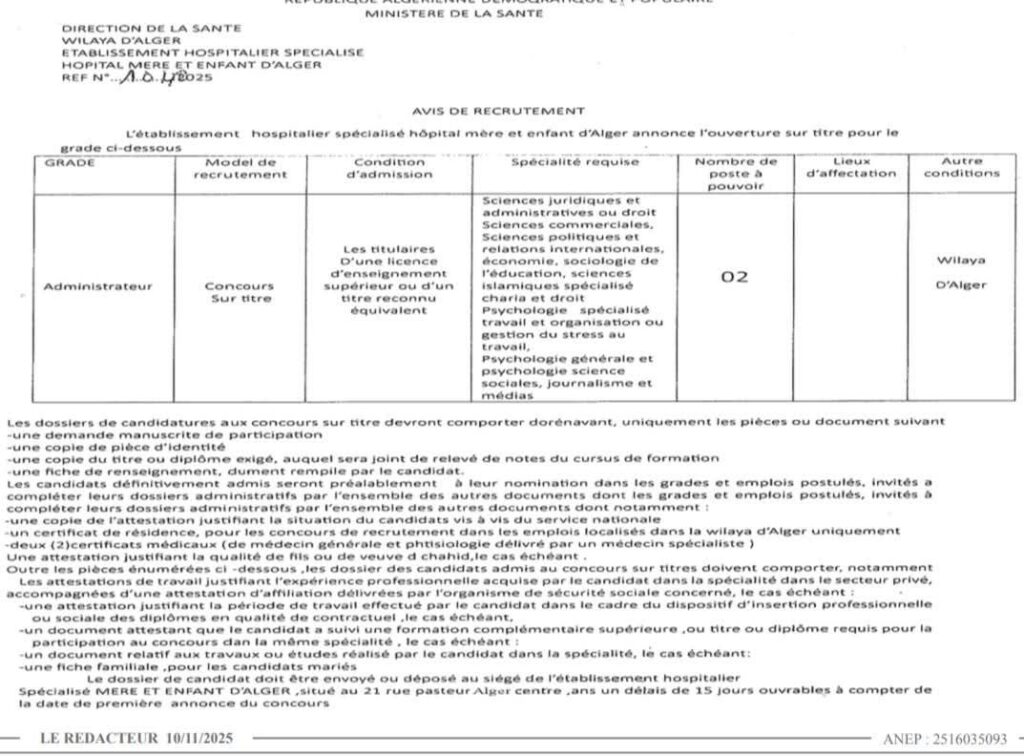 تُرسل أو تُودع ملفات الترشح على مستوى:المؤسسة الاستشفائية المتخصصة للأم والطفل – الجزائر