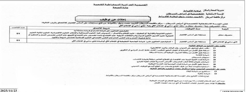 اعلان توظيف بالمؤسسة الاستشفائية المتخصصة في أمراض السرطان بالأغواط