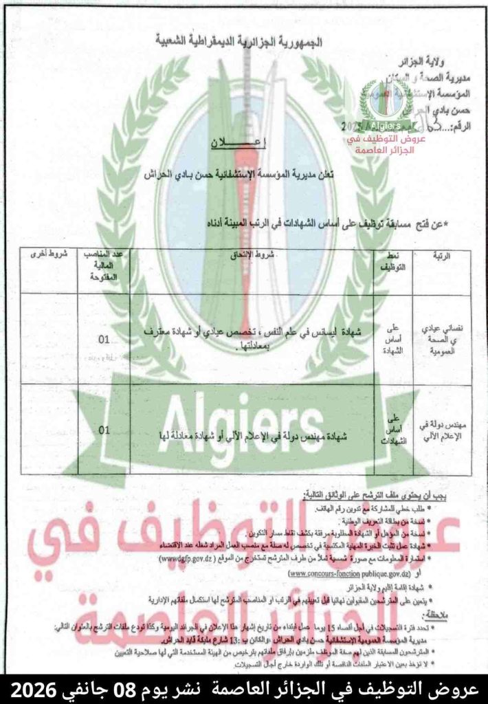 اعلان توظيف بالمؤسسة الاستشفائية حسن بادي الحراش لولاية الجزائر