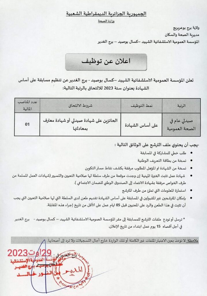 اعلان توظيف بالمؤسسة العمومية الاستشفائية الشهيد كمال بوصيد برج الغدير برج بوعريرج