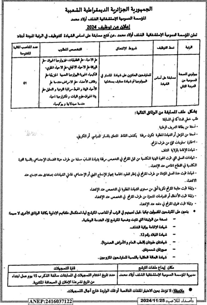 اعلان توظيف بالمؤسسة العمومية الاستشفائية الشلف أولاد محمد