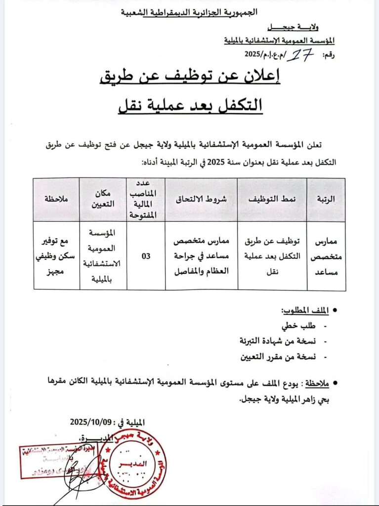 تعلن المؤسسة العمومية الاستشفائية بالميلية – ولاية جيجل – عن فتح توظيف عن طريق التكفل بعد عملية نقل بعنوان سنة 2025 في الرتبة المبينة أدناه: