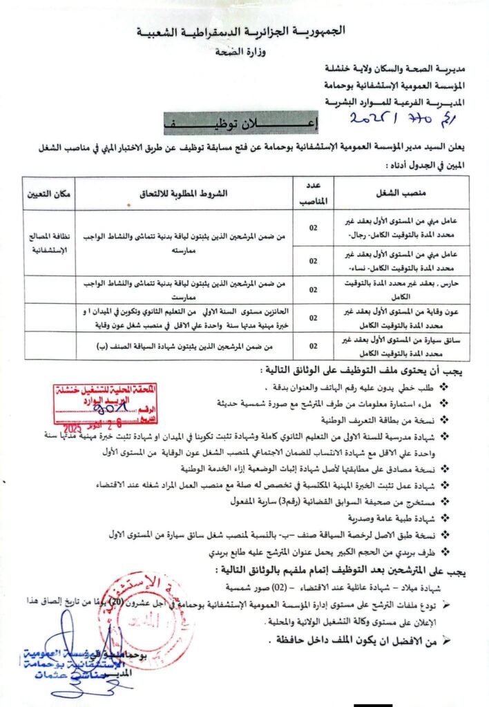 اعلان توظيف بالمؤسسة العمومية الاستشفائية بوحمامة لولاية خنشلة