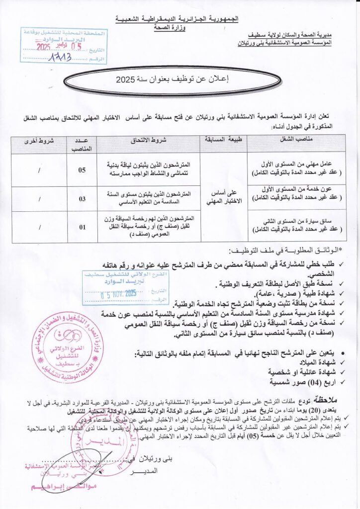 تعلن إدارة المؤسسة العمومية الاستشفائية بني ورتيلان عن فتح مسابقة توظيف على أساس الاختبار المهني للالتحاق بالمناصب التالية: