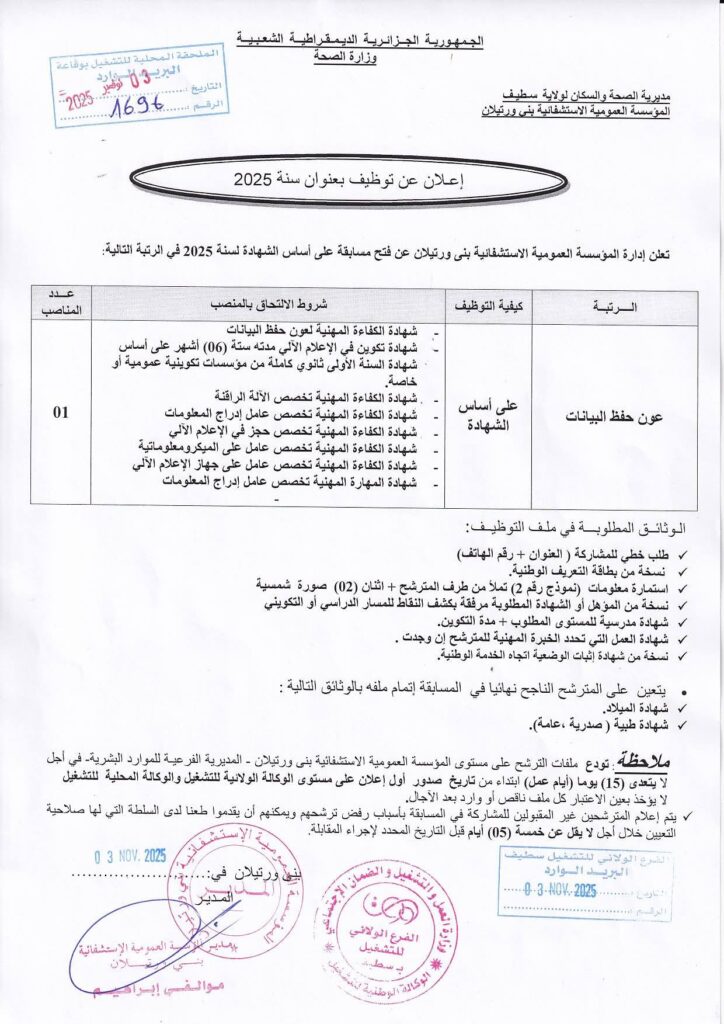 اعلان توظيف بالمؤسسة العمومية الاستشفائية بني ورتيلان سطيف