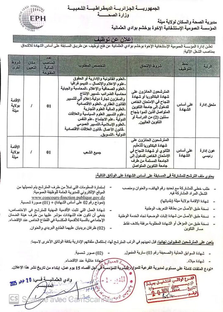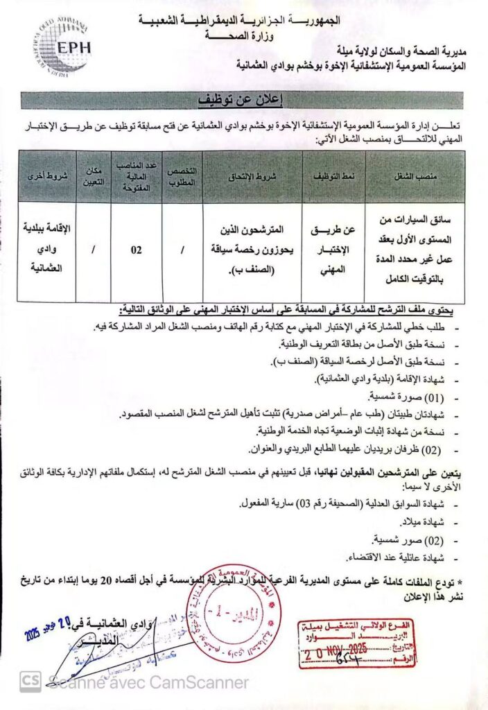 اعلان توظيف بالمؤسسة العمومية الاستشفائية الإخوة بوخشم بوادي العثمانية ميلة