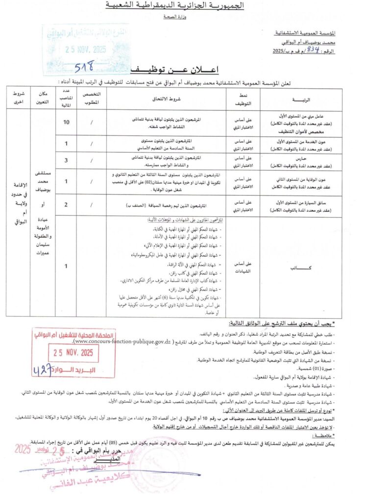 تعلن المؤسسة العمومية الاستشفائية محمد بوضياف – أم البواقي عن فتح مسابقات للتوظيف في الرتب المبينة أدناه: