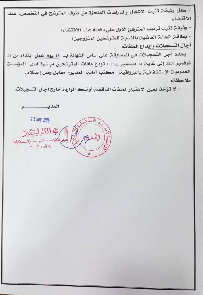 تعلن المؤسسة العمومية الاستشفائية بالبرواقية المدية عن فتح مسابقة للتوظيف في الرتب المبينة