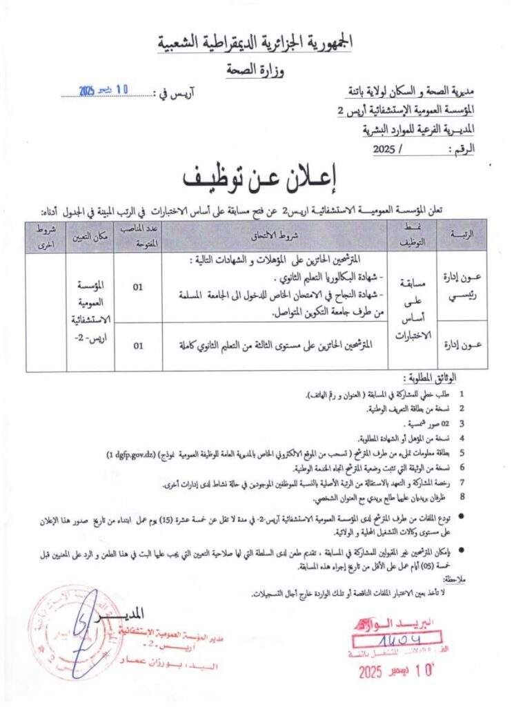 اعلان توظيف بالمؤسسة العمومية الاستشفائية آريس 2 باتنة