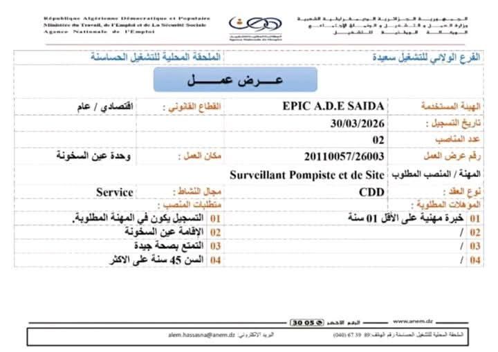 • الهيئة المستخدمة: EPIC A.D.E SAIDA (الجزائرية للمياه – وحدة سعيدة).