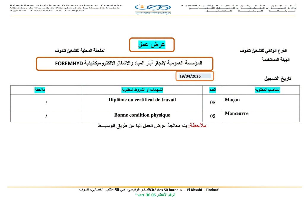 | Manœuvre (عامل يدوي) | 05 | Bonne condition physique | / |
