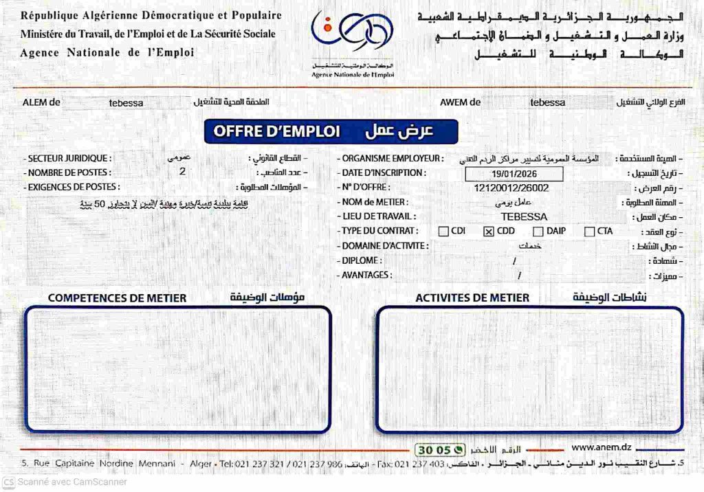 المؤهلات المطلوبة: إقامة بلدية تبسة / خبرة مهنية / السن لا يتجاوز 50 سنة
